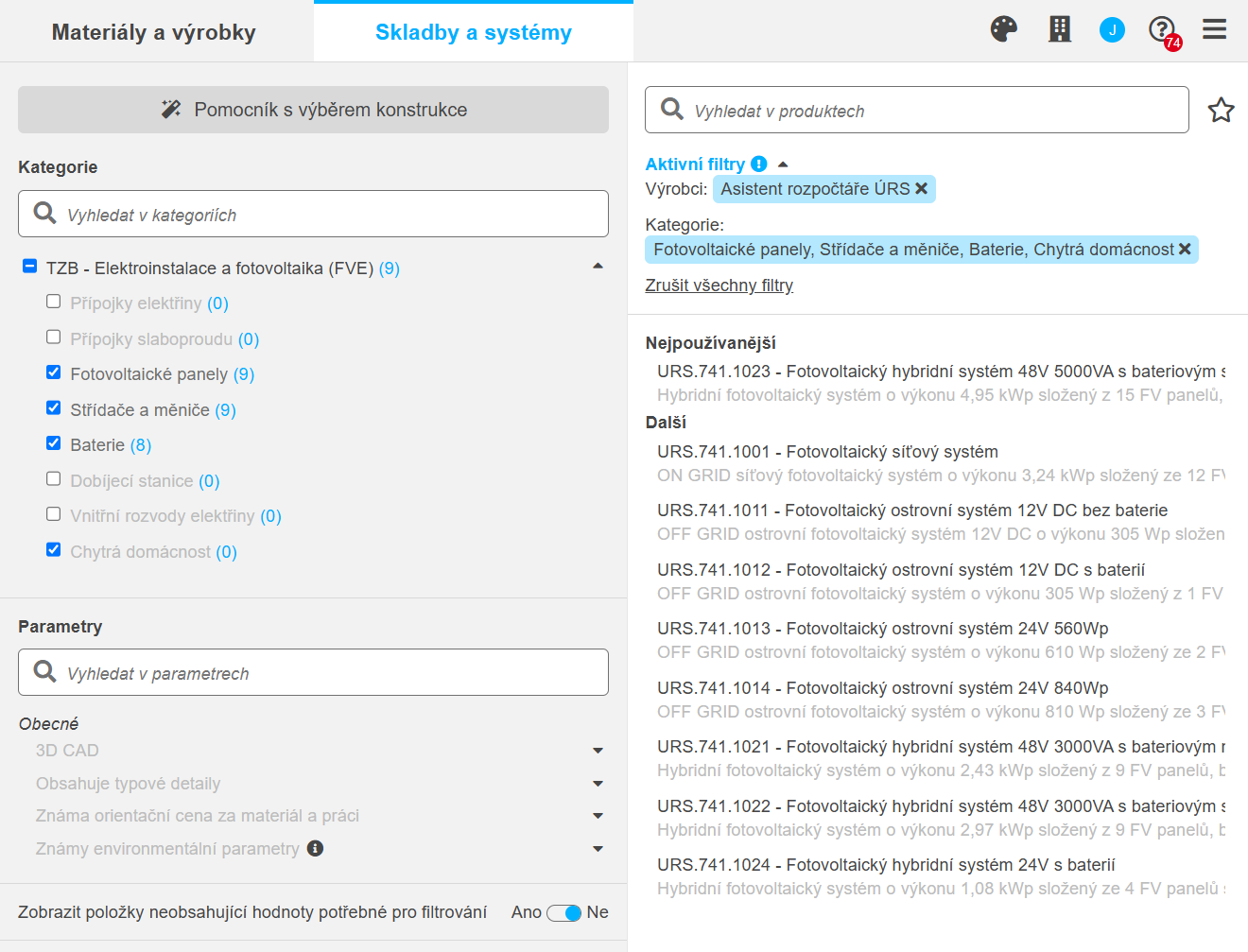 Po zatržení kapitoly TZB – Elektroinstalace a fotovoltaika (FVE) se Vám zobrazí Nejpoužívanější a Další požadované druhy Sestav položek z knihovny.
