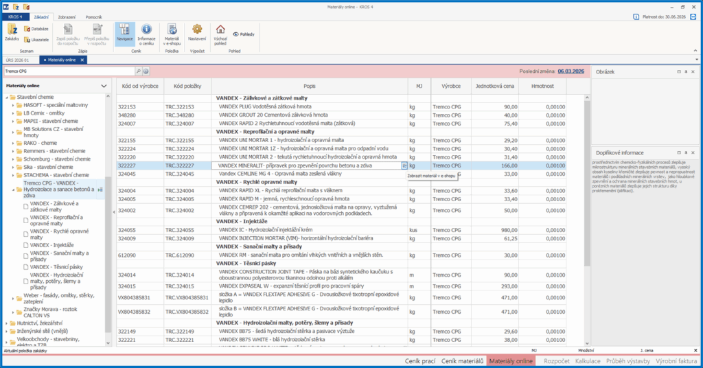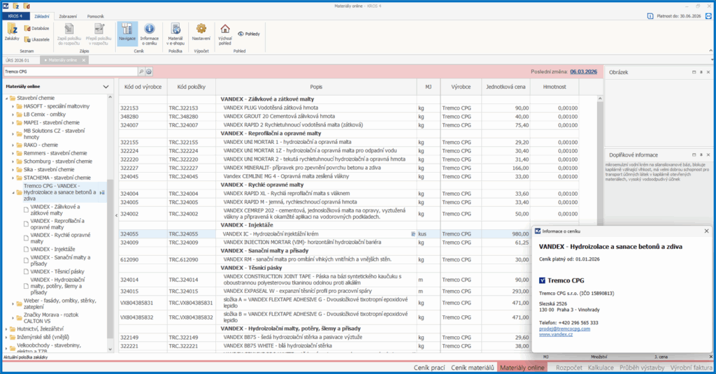 Náhled na sortiment TREMCO CPG výrobky VANDEX v SW KROS 4 v Materiálech online: